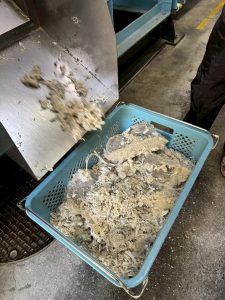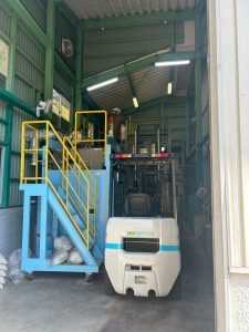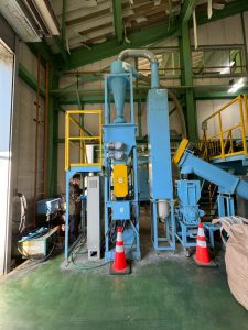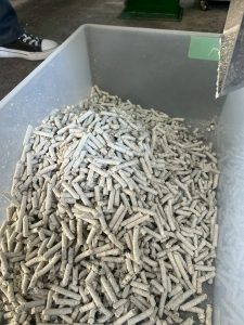 次の作業として燃料化装置に投入して16から18時間で滅菌処理がされたフラフが、重量が三分の一になって排出されます。その後、ペレットを作る別の装置にそのフラフが投入され、ペレットとして精製されます。